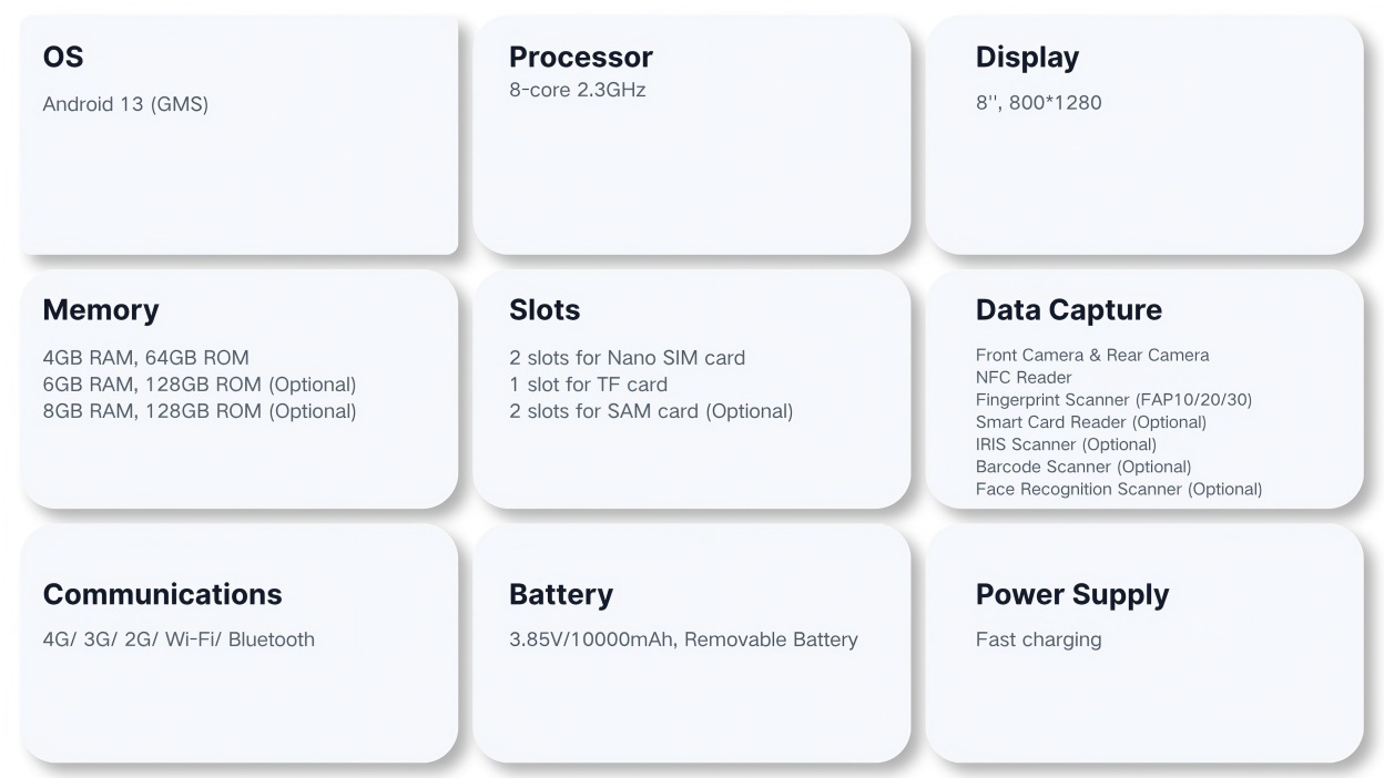 Développé pour des applications telles que le recensement, inscription des électeurs, soins de santé, éducation et sécurité publique, Applications pour les forces de l'ordre et l'identification électronique du client (eKYC).